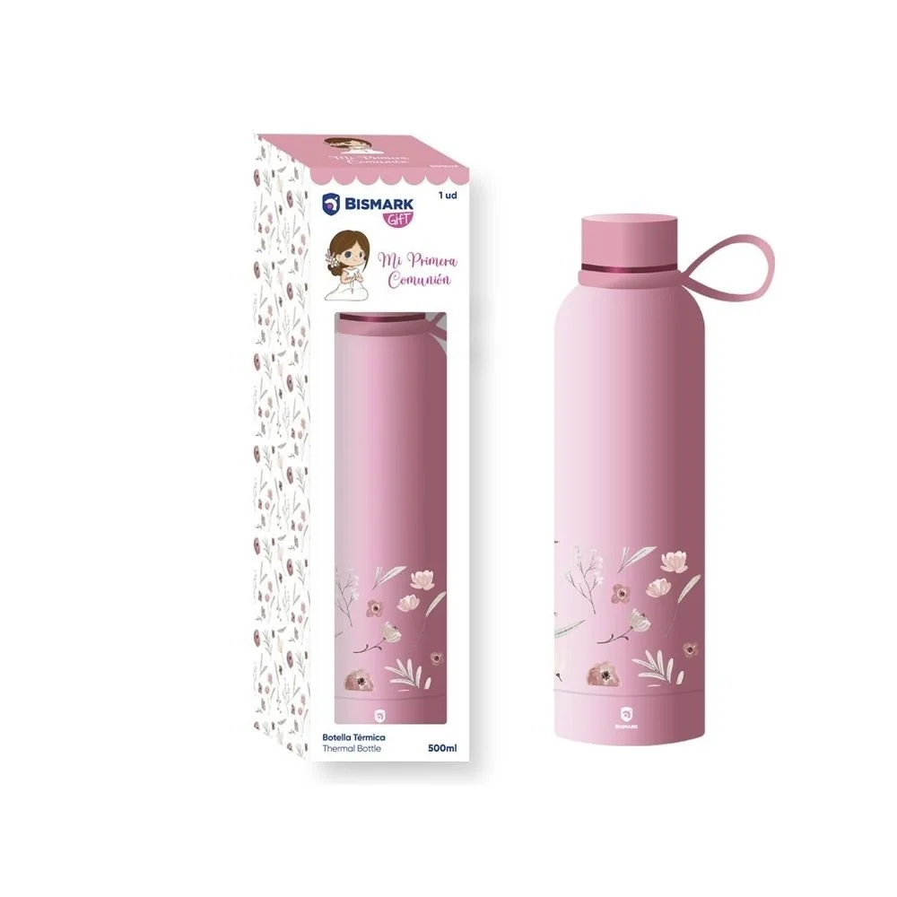 Botella térmica 500ml Mi Primera Comunión de niña con asa de goma tacto suave y decorado con florecitas. Presentada en caja, regalo ideal para la primera comunión. No apta para lavavajillas y microondas