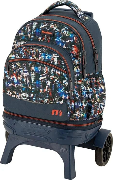 • Mochila escolar con carro desmontable. 2 usos en 1: el uso de Carro fijo de base resistente y el otro uso de solo mochila, pues se puede separar del carro a traves de la cremallera que los une. Tiene dos compartimientos amplios y un bolsillo frontal con un organizador interno. Tirantes ergonómicos de espuma transpirable con velcro al final que se adhieren al espaldar para que no se arrastren por el suelo. Bolsillo en el lateral derecha para llevar una botella . Asaacolchada de agarre superior. Cuenta con un forro escondido en la parte posterior de la mochila para cubrir las dos ruedas y así evitar que se ensucie la espalda.